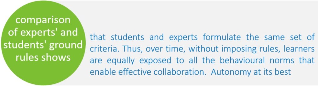 It is possible to set a comprehensive standard for collaboration and assess group members against that standard, but we have four arguments why we have not chosen this approach. Our first and most important argument is that the groups should make the rules themselves. It is their collaborative task, it is their responsibility (Blatchford et al., 2003). The role of the instructor is to help them in that task through convincing instruction, not to enforce rules of conduct. Regardless, if group members collectively decide to ignore the prescribed rules then they will also fill in the standardized assessment to their own liking and tick off behaviors that do not match reality. If we consider that both cognitive and social traits (social sensitivity) determine collective intelligence (Williams-Woolley et al., 2010) then the group’s incorrect behavioral choice will be paid for by a poor final product (under the condition that the task merits a collaborative approach, that is; if it is an authentic and a sufficiently complex task for a high level of interdependency (Kramer & Kursurkar, 2017, and citations therein)). Here is where instructors have their say. If students don’t bother with a bad product, then any rule (or instruction) is lost anyway. A second argument is that tasks and groups are often different, and self-made rules allow for emphasis on specific aspects of the task and the group (Salas et al., 2005, p570). A third argument is that, like standard tests for school disciplines, group members may work more for the test (performance oriented) and less for the task (mastery oriented, or goal oriented) (Deci et al., 1981; Smither, et al., 2005). Finally, as far as learning to collaborate is concerned, we mention that when students participate in multiple collaborative projects and in different groups, the sum of the rules will match the list of behaviorally-anchored criteria established by experts. Comparison of ground rules proposed by experts and students (see figure 1 above) show that students and experts formulate the same set of criteria. Thus, without imposing rules, learners are, over time, equally exposed to all the behavioral norms that enable effective collaboration. Autonomy at its best!