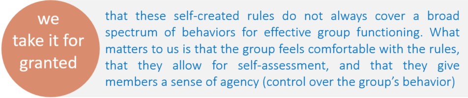 Although we give groups a great deal of freedom, we sometimes intervene in setting the rules. For example, if they propose few “behaviorally-anchored” criteria. If groups only write holistic rules, such as “make collaboration work,” “make the group work”, “be enthusiastic”, or “contribute to the success of the project”, we ask them to be more precise. What quality of behavior “makes a group work”, or “makes collaboration work”, or “how can you contribute to the success of the project”? One or two holistic rules are not a problem. It is also common for groups to write rules about how the group should function, such as: “the group must work well together”. You can’t turn such a rule into an individual survey question. We then help to reformulate the rule. Often they come up with a new proposal themselves, for example, “completing the work assigned by the group in a timely manner”. The survey question then becomes, “Does she/he (do I) completes the work assigned by the group in a timely manner?” We also intervene when the focus is only on social criteria and not on quality, or vice versa. We then make suggestions along the lines of what happens if someone is at meetings on time and listens to others, but repeatedly works on an unassigned topic? Or what if someone works very hard but systematically fails to communicate the results in time. In the last examples, where the rules are appropriate for individual assessment but the scope may be very limited, we leave it up to the group to change or not. We do not enforce changes.