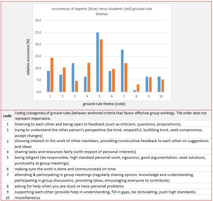 The histogram shows similitudes and differences in the relative occurrence of ground rules. Both experts and students place most emphasis on the work ethos of the group, which can be summed up by being diligent: “high quality work”, “set high standards”, “good argumentation”, “personal (original) work”, and “rigorous participation in all activities” (be it personal research or group meetings). For the students, “listening to each other” and “being open to feedback” (code 1) is a second frequently written rule. The high frequency is certainly the result of the example we give to start the group discussion. A “fair division of tasks” (code 4) is also often reported. Students describe this as “contributing to an equal share of the project tasks”. The experts place great emphasis on “attending and actively participating in group meetings” (code 7). A criterion that students also often refer to in terms of “actively participating in group sessions”, “sharing (personal) opinions”, “sharing your findings” or “communicating with the group”. A last important theme we mention is “trying to understand each other” (code 2). Students find mutual respect very important, members should “make an effort to seek compromise” and “everybody must endeavors to create a non-hostile environment”. With respect to miscellaneous (code 10), we find rules such as “enjoy the learning task”, “kindness and goodwill are paramount”, “be honest”, “be in a good mood” or “switch off your smartphone in work sessions”. You will find all propositions in an attached excel file at the end of this article (see also Kramer, 2024). We observe a large discrepancy between experts and students in code 3, ‘showing interest in the work of other members’. This may reflect a common problem observed in group work: Students work for themselves and the collaboration is little more than a logical compilation of individual contributions without much exchange (Baker et al., 1999).