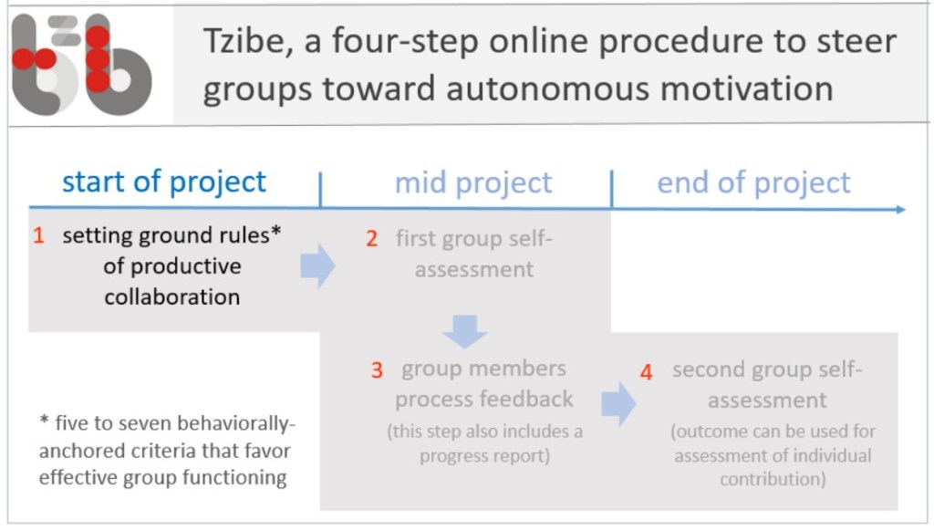 The self-assessment procedure we have developed is based on a “category approach”. It differs from those previously discussed (Brown, 1995; Conway, 1993; Lejk & Wyvill, 2001a, 2001b), and from other online group-evaluation applications (O’Neill et al., 2018; Freeman & McKenzie, 2002), in that group members define their own group-functioning rules; a minimum of five and a maximum of seven. We refer to these rules as “ground rules”; they are behaviorally-anchored criteria that favor effective group functioning. The instructor, or leader, may give hints about characteristics of effective groups to spark discussion, but the ground rules are not imposed on the group. The group self-assessment includes four events shown in Figure 1 below. In addition to these events, we organize three formal sessions in which the groups discuss the project with an instructor. The self-assessment events and discussion sessions are referred to as project tutorials. In this page we discuss the start of the project.