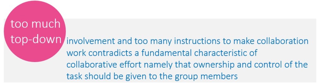 There are however limits to what a teacher/leader can do and should do. For instance, individual testing is hardly feasible when the tasks are complex, open ended, and requiring different skills that are impossible to measure individually (Strong & Anderson, 1990). Also, with respect to monitoring and correcting group functioning, in numerous occasions group members will spent more time working on their task “out of sight”. Moreover, we repeatedly observed, as bystanders in evaluation sessions at school, that teachers (and probably also company leaders) have biased views of group functioning. Indeed several studies revealed that teachers differentiate their behaviors towards individual students based on their expectancies of those students (Domen et al., 2019; Harris & Rosenthal, 1985). This is an undesirable situation for collaborative projects because it may force students (or employees), who now have the unique opportunity to express themselves differently, to resume the role they have been “assigned” in traditional class teaching (or work settings). Finally, too much top-down involvement and too many instructions to make collaboration work contradicts a fundamental characteristic of collaborative effort namely that ownership and control of the task should be given to the group members (Blatchford, 2003). This is beyond our competence, but it is quite possible that too much top-down intervention is a major cause of poor transactive dialogue in work organizations; it makes collaboration “busy work” (discussed in “a potential loss of autonomy”). In architectural terms, it is more about form than function and leads to staff malfunctioning (Cross et al., 2016). In both education- and work settings, this can result in members focusing on teachers or on managers, rather than on the task and the group of which they are a part.