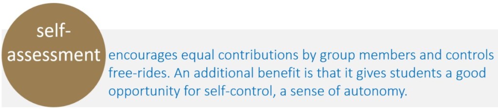 Research on the impact of group self-assessment has focused primarily on the need for individual accountability and the sense of fairness experienced by students (citations above). As for secondary or higher education, few studies deal with the potential beneficial effects on collaborative learning. Three studies report an increase in student engagement (Kench et al. 2009; Mello, 1993; Weaver & Esposto, 2012) and one study reports that self-assessment encourages equal contributions by group members and controls free-rides (Freeman & cKenzie, 2002). As already mentioned, an additional benefit of self-assessment is that it gives students a good opportunity for self-control, a sense of autonomy, the subject of the group self-evaluation procedure that we discuss in the next pages.