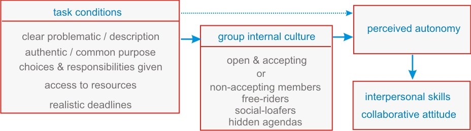 Within a collaborative project we distinguish two levels of autonomy. The first deals with the conditions of the task; to what extent is the task autonomy supportive. Does the task offer choices and does it give sufficient responsibilities to the group. Students refer to this level as “self-control” (Scager et al., 2016). The second deals with group beliefs, to what extent is the group internal culture autonomy supportive? A key point in our argument is that the dysfunction of one member, for instance a free rider or a non-accepting dominant member, effectively removes control of group functioning from all members, even when the learning task is intended to provide students with a great deal of self-control. This perceived lack of control, as well as the possible anticipation of non-collaborative behavior, deprives members of perceived autonomy and thus has a negative effect on autonomous motivation and therefore may have negative consequences on how students operate in the group and how they experience the normally autonomy-supportive learning task (figure 1) (Aggarwal & O’Brien, 2008; described in “Relationship Motivation Theory”, Theorem VI, Chapter 12, p311, Ryan & Deci, 2017).